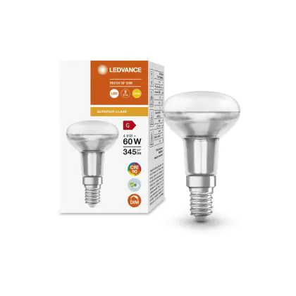 La lampe LED Ledvance Superior R50 LED E14 Spot Dépolie 4.8W 345lm - 927 | Dimmable - Meilleur rendu de couleur avec culot E14 (Ampoule à vis petit culot) est le remplacement idéal des lampes à incandescence et halogènes classiques. En raison de la faible consommation d'énergie, vous économisez considérablement sur vos coûts d'énergie. Les lampes à LED Ledvance n’utilisent qu’une petite partie de la puissance (4.8 W) que les lampes à incandescence et halogènes classiques (60 W). Les lampes à LED ont une excellente classe énergétique G, ce qui signifie qu'elles sont très écologiques et peuvent être recyclées après utilisation. En raison de leur durée de vie considérable de 25000 heures, vous n’aurez pas à les changer de si tôt.